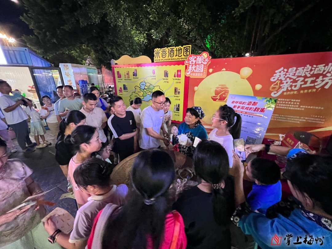 值得一提的是,“我是酿酒师”亲子工坊成为当晚的温馨一角。家长和孩子们在梅州市客家天地酒业有限公司董事长、火炙黄酒非遗传承人黄淑辉的指导讲解下,了解客家米酒的酿造知识,亲手体验制作的乐趣。“希望通过寓教于乐的方式,让更多年轻一代了解客家娘酒,懂得酿造工艺。”黄淑辉表示,其公司成立以来,一直致力于传承客家黄酒文化,近期通过创新技术,研发了无醇黄酒、中国清酒、低糖的火炙娘酒和柚子酒。市民陈先生表示,这个活动不仅让孩子了解客家酿酒文化,更让他们全家一起动手,这种亲子互动的快乐,比什么都珍贵。