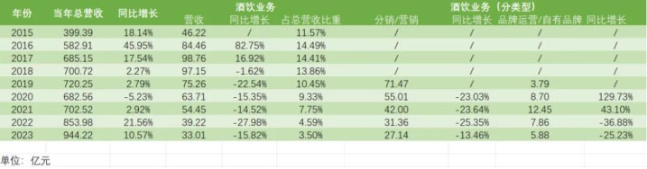 其中,酒饮品牌运营/自有品牌业务营收分别为8.7亿元、12.45亿元、7.86亿元和5.88亿元,从2021年开始呈现明显下滑趋势。
